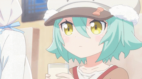 Paglalarawan ng Content: a girl with green hair and a hat holds a glass of milk