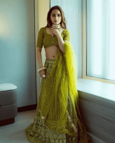 Paglalarawan ng Content: a woman in a green dress is standing by a window