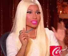 Paglalarawan ng Content: a woman with blonde hair and pink lips is holding a coca cola cup .
