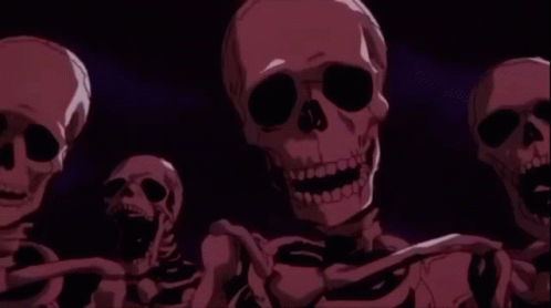 Paglalarawan ng Content: a group of skeletons are standing next to each other in a dark room and smiling .