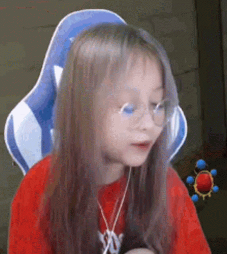 Paglalarawan ng Content: a little girl wearing glasses and a red shirt is sitting in a blue chair .