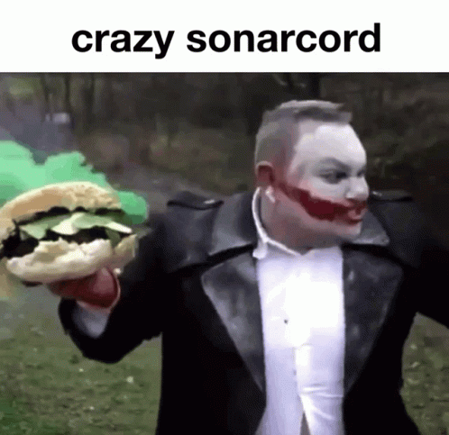 Paglalarawan ng Content: a man in a joker costume is holding a hamburger with smoke coming out of his mouth