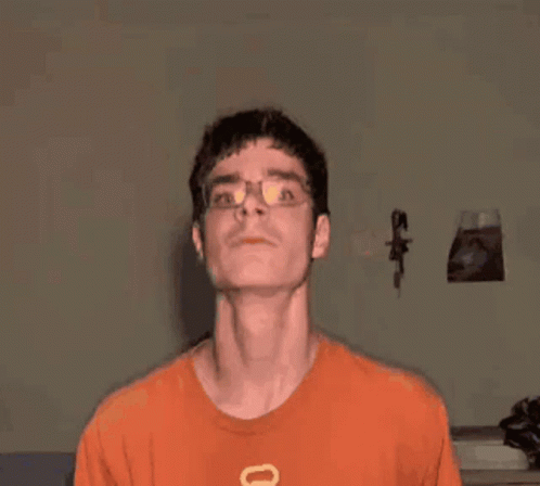 Paglalarawan ng Content: a man wearing glasses and an orange shirt with the letter u on it .