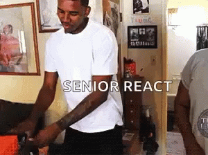 Paglalarawan ng Content: a man in a white shirt is standing in a room with the words senior react above him