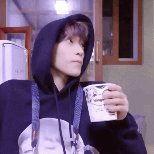 Paglalarawan ng Content: a man wearing a hoodie is holding a cup of haagen dazs ice cream