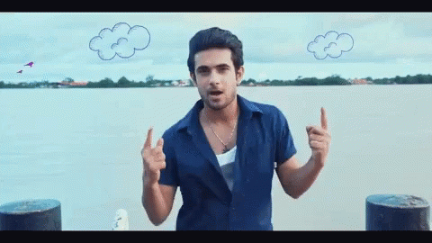 Paglalarawan ng Content: a man in a blue shirt stands in front of a body of water with clouds drawn on it .