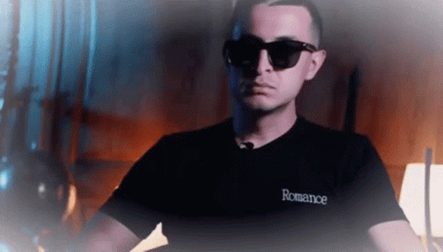 Paglalarawan ng Content: a man wearing sunglasses and a black t-shirt that says romance