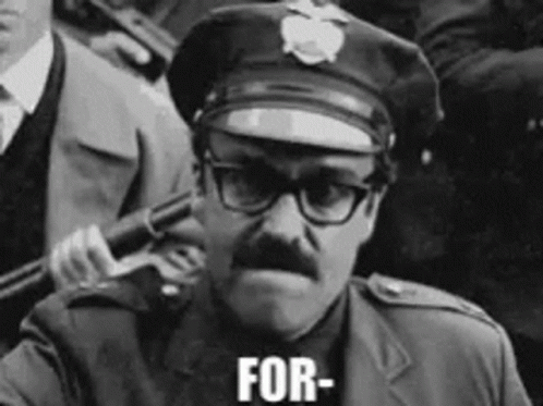 Paglalarawan ng Content: a black and white photo of a police officer holding a gun and the words for written on his face