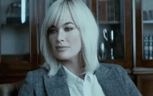Paglalarawan ng Content: a woman with blonde hair and a gray suit is sitting on a couch in a room .