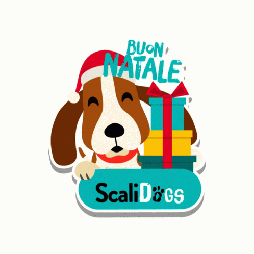 Paglalarawan ng Content: a dog wearing a santa hat is holding a gift box and a sign that says scali dogs