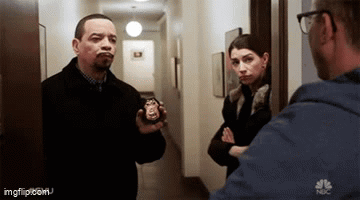 Paglalarawan ng Content: a man is holding a police badge in a hallway while talking to a woman .