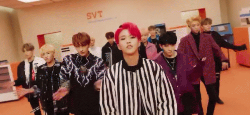 Paglalarawan ng Content: a group of young men are dancing in a room with a sign that says svt .