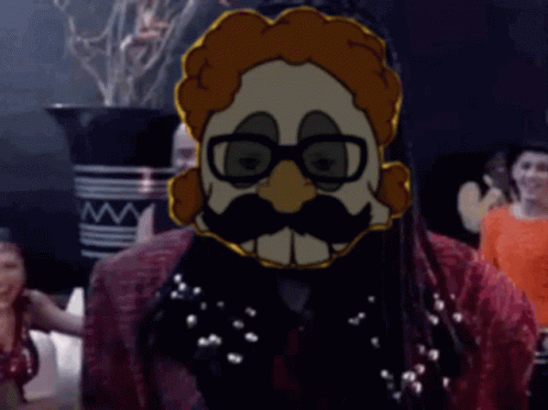 Paglalarawan ng Content: a cartoon character with glasses and a mustache is wearing a black jacket that says commmmmm