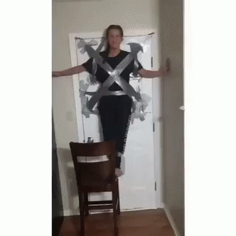 Paglalarawan ng Content: a woman is standing on a chair with duct tape around her .