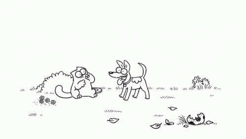 Paglalarawan ng Content: a black and white drawing of a cat playing frisbee with two dogs