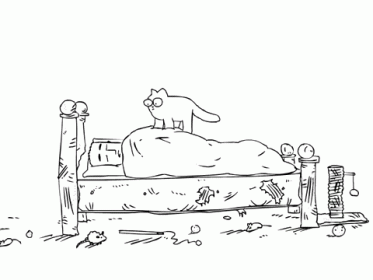 Paglalarawan ng Content: a black and white drawing of a man laying on a bed with a cat