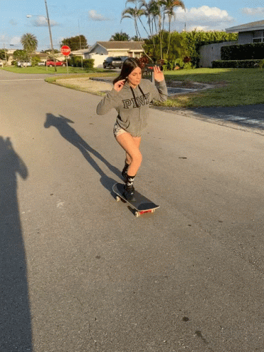 Paglalarawan ng Content: a girl wearing a pink hoodie rides a skateboard down a street