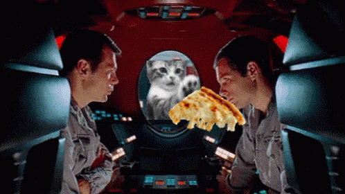 Paglalarawan ng Content: two men are sitting in a spaceship with a cat looking out the window and a piece of pizza in front of them .