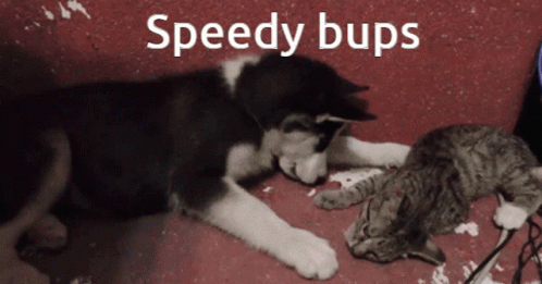 Paglalarawan ng Content: a dog and a kitten are laying on a red carpet and the words speedy bups are on the bottom
