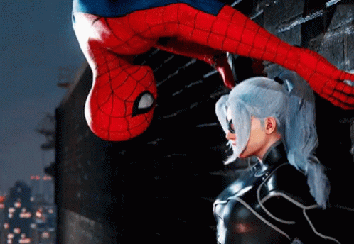Paglalarawan ng Content: a woman in a black suit is standing next to a spider man in a red and blue suit