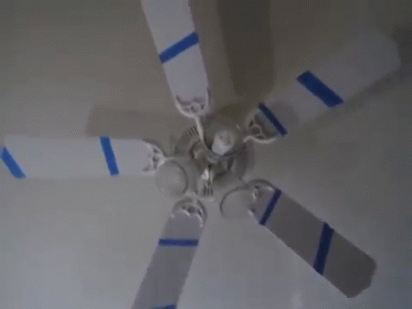 Paglalarawan ng Content: a white ceiling fan with blue tape covering the blades