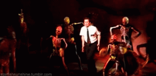 Paglalarawan ng Content: a man in a white shirt and tie is surrounded by skeletons dancing