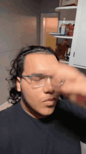 Paglalarawan ng Content: a man wearing glasses and a black shirt holds his hand to his face
