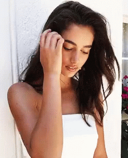 Paglalarawan ng Content: a woman in a white strapless top is standing in front of a white wall