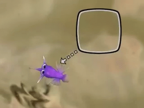 Paglalarawan ng Content: a purple fish is flying towards a square with an arrow pointing to it ..