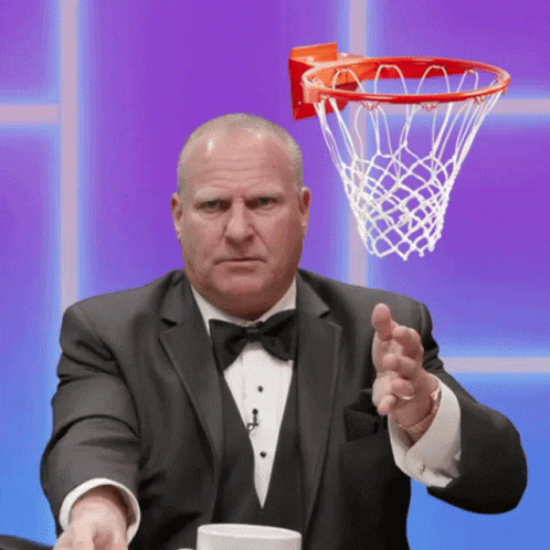Paglalarawan ng Content: a man in a tuxedo and bow tie throws a basketball into a basketball hoop