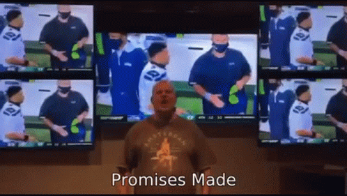 Paglalarawan ng Content: a man stands in front of a wall of televisions with promises made written on the bottom