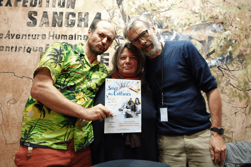 Paglalarawan ng Content: three people pose for a photo in front of a sign that says sangha on it