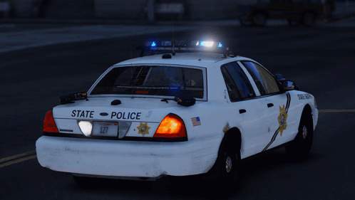 Paglalarawan ng Content: a white state police car is driving down the street at night