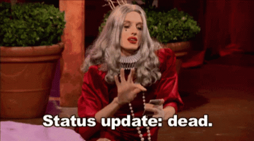 Paglalarawan ng Content: a woman in a red dress is holding a cell phone and saying " status update : dead "