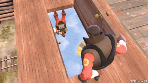 Paglalarawan ng Content: a man in a red uniform is standing on a wooden deck with a reflection of himself in a doorway
