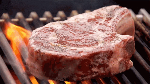Paglalarawan ng Content: a large steak is cooking on a grill with flames