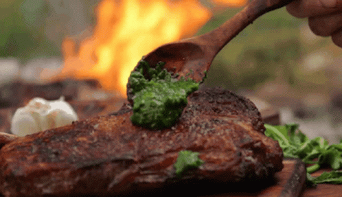 Paglalarawan ng Content: a wooden spoon is being used to spread pesto on a steak