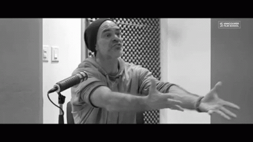 Paglalarawan ng Content: a man is sitting in front of a microphone with his arms outstretched in a black and white photo