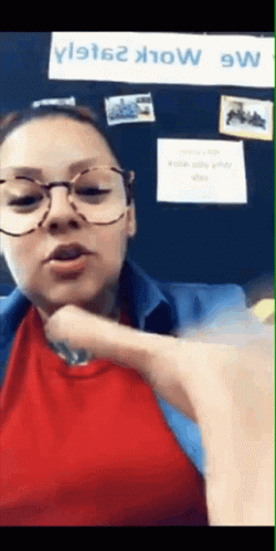 Paglalarawan ng Content: a woman wearing glasses and a red shirt is pointing at something .