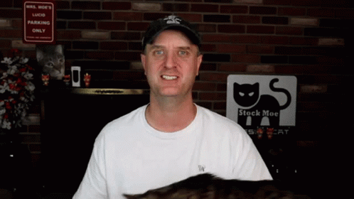 Paglalarawan ng Content: a man holds a cat in front of a stock moe sign