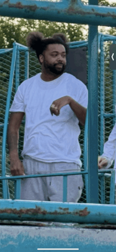 Paglalarawan ng Content: a man in a white shirt is standing in front of a blue metal fence