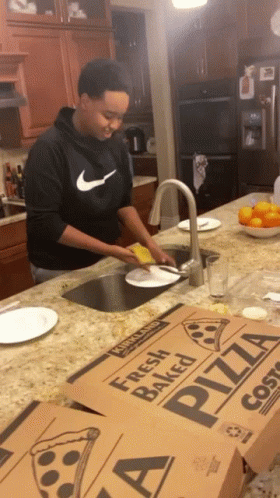Paglalarawan ng Content: a man in a black nike sweatshirt is washing plates in the kitchen
