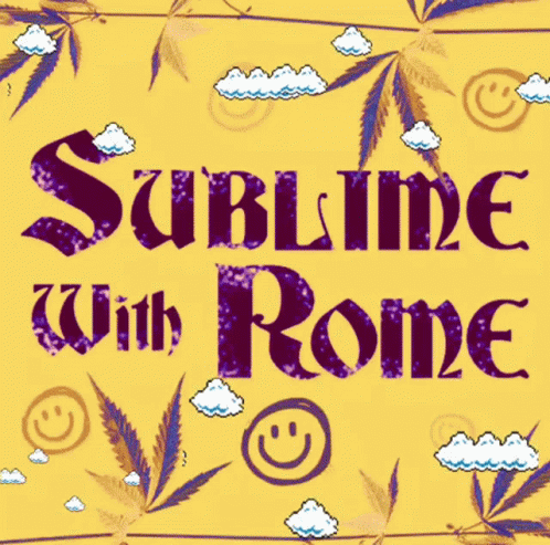Paglalarawan ng Content: sublime with rome is written on a yellow background with marijuana leaves and clouds