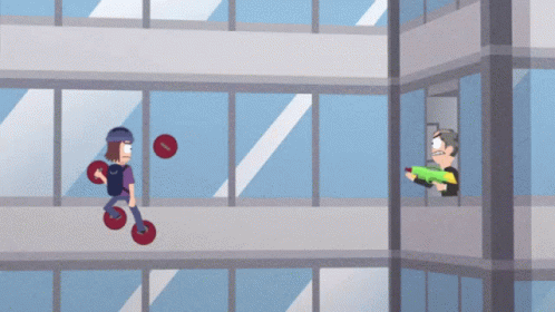 Paglalarawan ng Content: a cartoon of a man holding a water gun and another man riding a bike