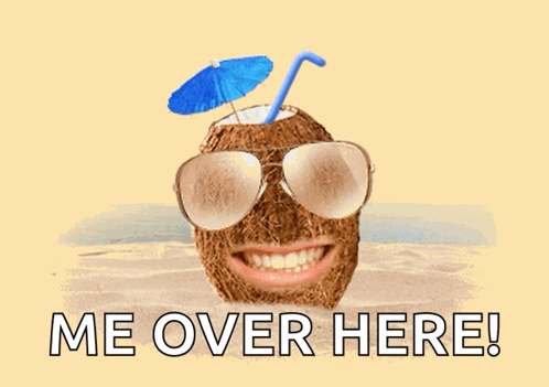 Paglalarawan ng Content: a coconut with sunglasses and an umbrella in it and the words me over here below it
