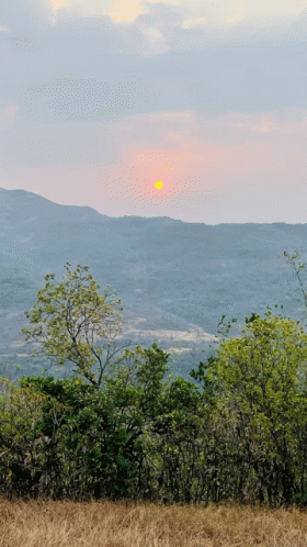 Paglalarawan ng Content: a sunset over a valley with trees and mountains in the background