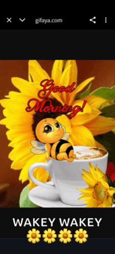 Paglalarawan ng Content: a picture of a bee sitting on a cup of coffee that says good morning
