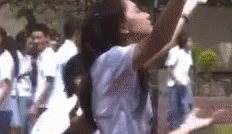 Paglalarawan ng Content: a girl in a school uniform is taking a picture of herself in front of a group of people .