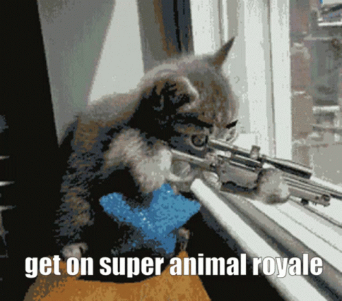 Paglalarawan ng Content: a cat is holding a gun in front of a window and says get on super animal royale on the bottom