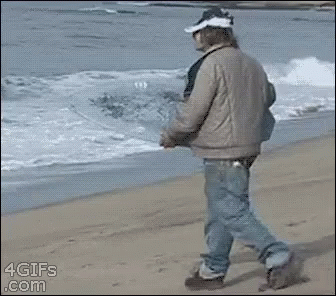 Paglalarawan ng Content: a man is bending over on the beach in front of a wave